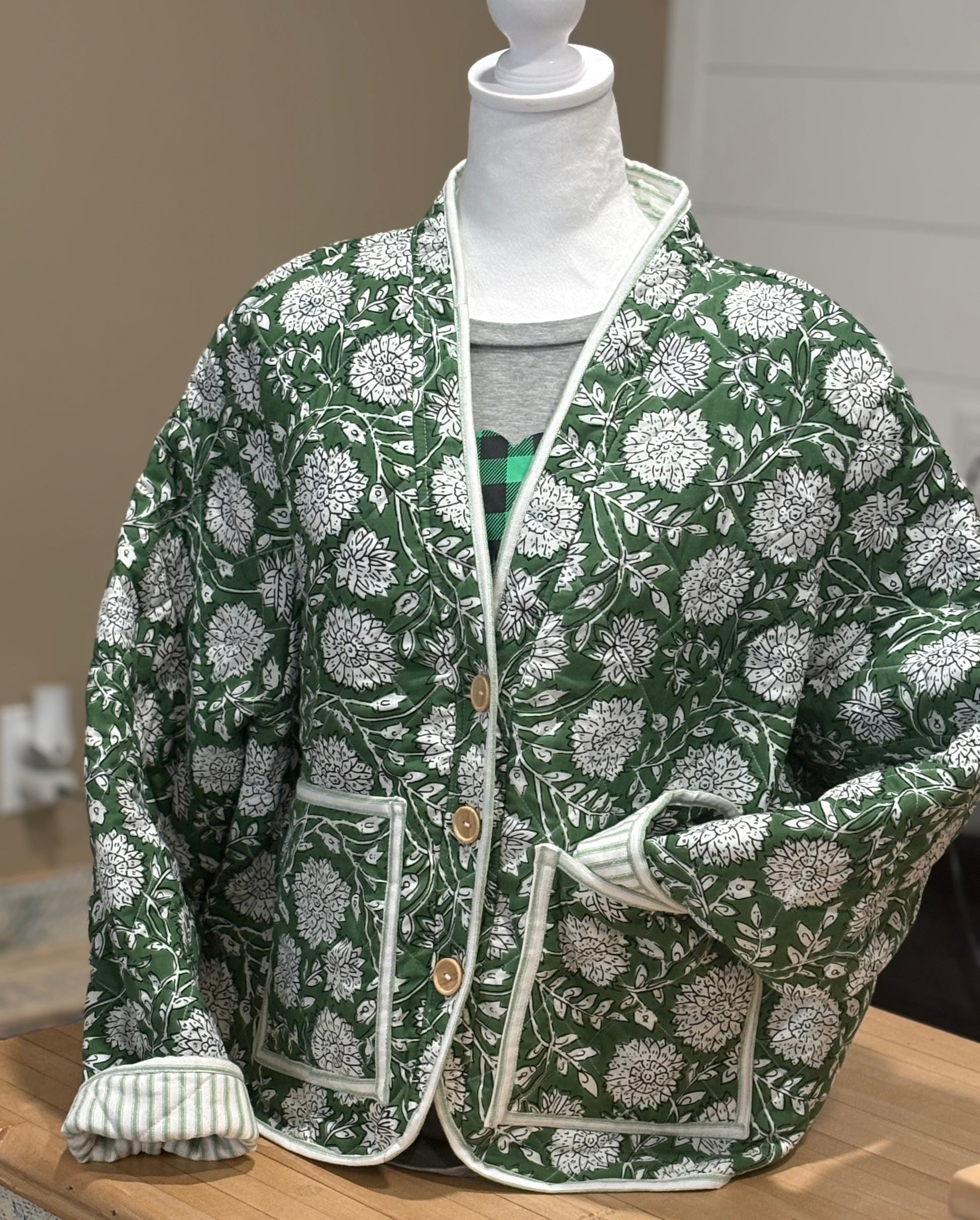 This beautiful green quilted jacket is custom made by a local designer, Shelley Fernandez. This is a piece that is so well handcrafted, that it will last a lifetime.